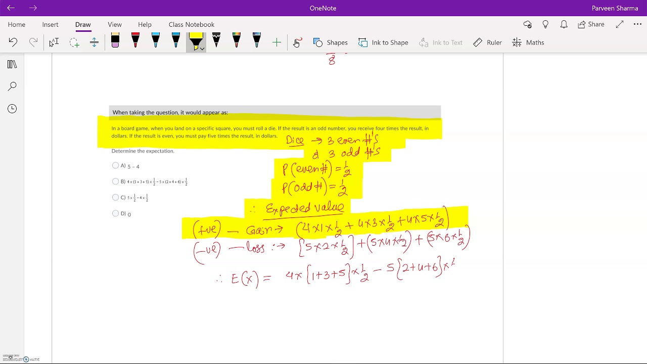 Labyrinthian: Expected Value & Daily Fantasy DraftKings ... from s3.amazonaws.com In order to select the right project, you need to calculate the expected value of each project and compare the values with each other. Use the expected value formula to obtain: E ( x ) = 1 ( 1 6 ) + 2 ( 1 6 ) + 1 ( 1 6 ) + 2 ( 1 6 ) + 1 ( 1 6 ) + 2 ( 1 6 ) = 1 6 + 2 6 + 1 6 + 2 6 + 1 6 + 2 6 = 9 6 = 1.5. See full list on corporatefinanceinstitute.com See full list on educba.com Press 2nd and then press mode to return to the home screen. Next, compute the probability of occurrence of each value of the random variable and they are denoted by p(x1), p(x2), …., p(xn) or p(xi). X̄ = ∑xi * p(xi) step 4:next, compute each value's deviation (step 1) of the random variable from the mean (step 3) of the probability distribution.